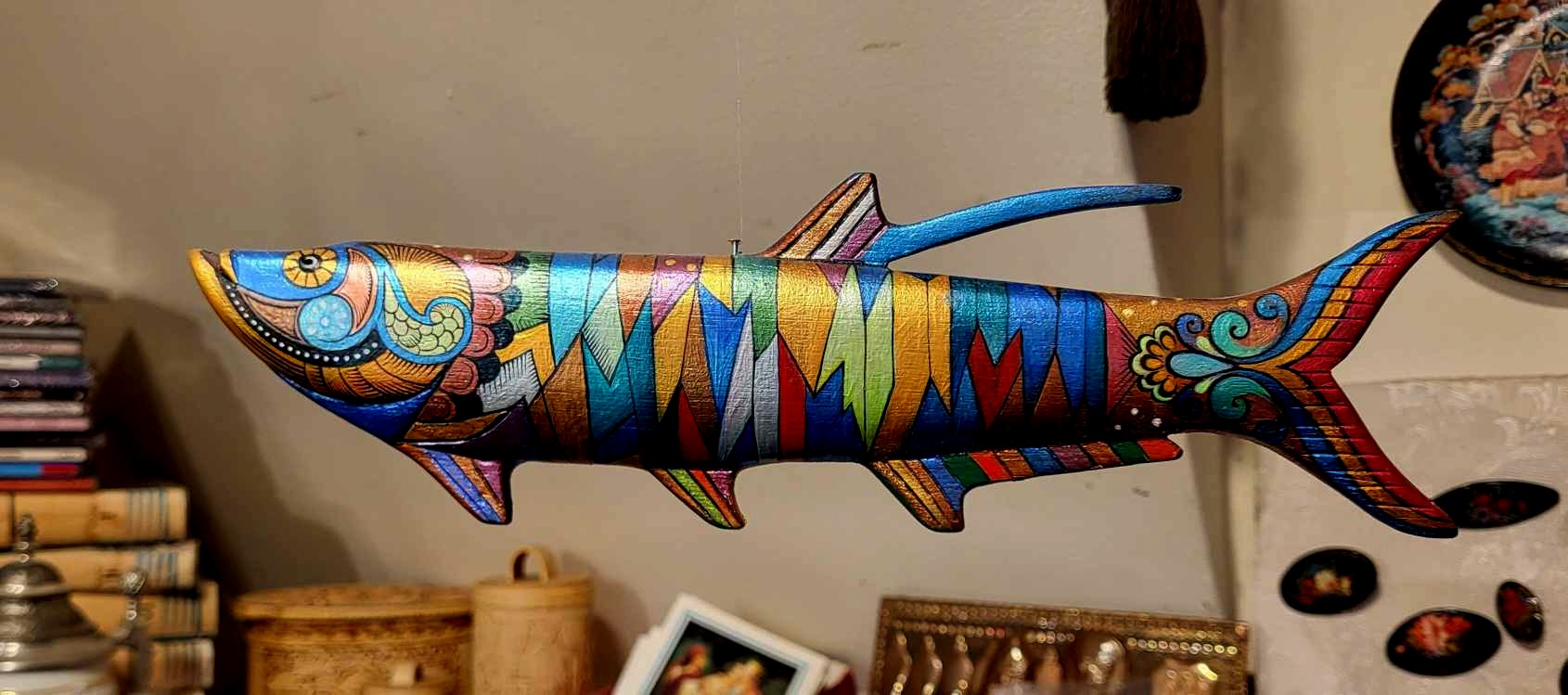 This vibrant, hand-painted wooden fish sculpture dazzles with its symmetrical whimsy and folkloric flair, suspended mid-air as if frozen in an eternal swim. Viewed from either side, the fish is a riot of rhythmic color—sharp chevrons and zigzagging stripes in jewel tones of cobalt, emerald, crimson, and gold give the body a pulsing sense of movement. The head is elaborately adorned with stylized motifs and curling embellishments, while the tail blooms with floral patterns and elegant scrollwork, differing slightly on each side to maintain visual intrigue. Painted with acrylics, the surface shimmers subtly, and the hanging installation via fish wire adds to the illusion of effortless buoyancy. This is a playful and sophisticated piece that fuses folk art sensibilities with contemporary decorative charm—ideal for collectors of whimsical sculpture or fans of kinetic visual storytelling.